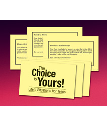 Participants learn to consider, explore, and discuss various options to the difficult, real-life situations presented in this activity card set. Topics include cheating, bullies, dating and sex, parties, parental expectations, siblings, personal responsibilities, drinking, money, smoking, and drug use. Meets National Family and Consumer Science Education Standards and National Health Education Standards. Includes 30 situation cards, idea sheet, and instructions. For 2 or more players or teams. Grades 6-12.