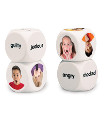 A great tool for teaching the vocabulary of emotions related to social interactions, this set of cubes features two cubes with photographs of children's facial expressions and two cubes with words such as 'jealous' and 'shocked'. Each cube is made of soft foam and measures 1 ½". Includes activity guide. Grades 1-5