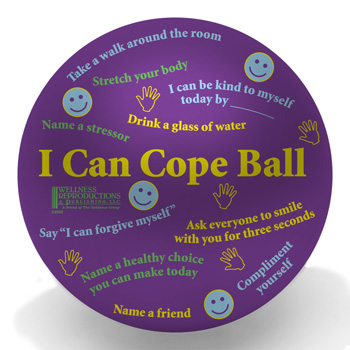 I Can Cope Ball. Ages: 12-18. Share simple ideas for how to cope with stress with such prompts as "Describe a peaceful place" and Breathe deeply and release your stress."
