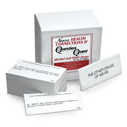 Set of alcohol and other drugs question-and-answer cards covering six categories: Drink, Drink, and Be Wary (Alcohol and Health); I Only Had One (Drinking Problems in Our Society and Alcoholism); Used as Directed, Will Kill the Customer (Smoking and Health); It's Your Dreams (Marijuana, LSD, and Inhalants); Big Business (Over-the-Counter and Prescription Drugs); and The Other Drugs of Abuse
