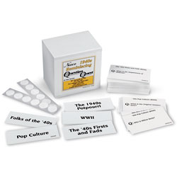 Set of reminiscing question-and-answer cards covers six categories based on the 1940s: Pop Culture, The '40s First and Fads, Events in the U.S. and the World, WWII, Folks of the '40s, and The 1940s Potpourri. Excellent for Seniors' Events.