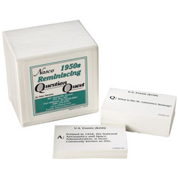 This set of reminiscing question-and-answer cards covers six categories based in the 1950s: Potpourri; U.S. Events; Famous Folk; Firsts and Fads; '50s TV, Movies, Music, and More; and World Events. Excellent for Seniors' Events.
