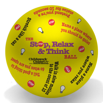 Stop, Relax & Think Ball. Ages: 6 & Up. Teach children to control their impulsivity by helping them understand and control their actions. Statements include "Tell about a good plan you made" and "Say your name loudly, then softly."